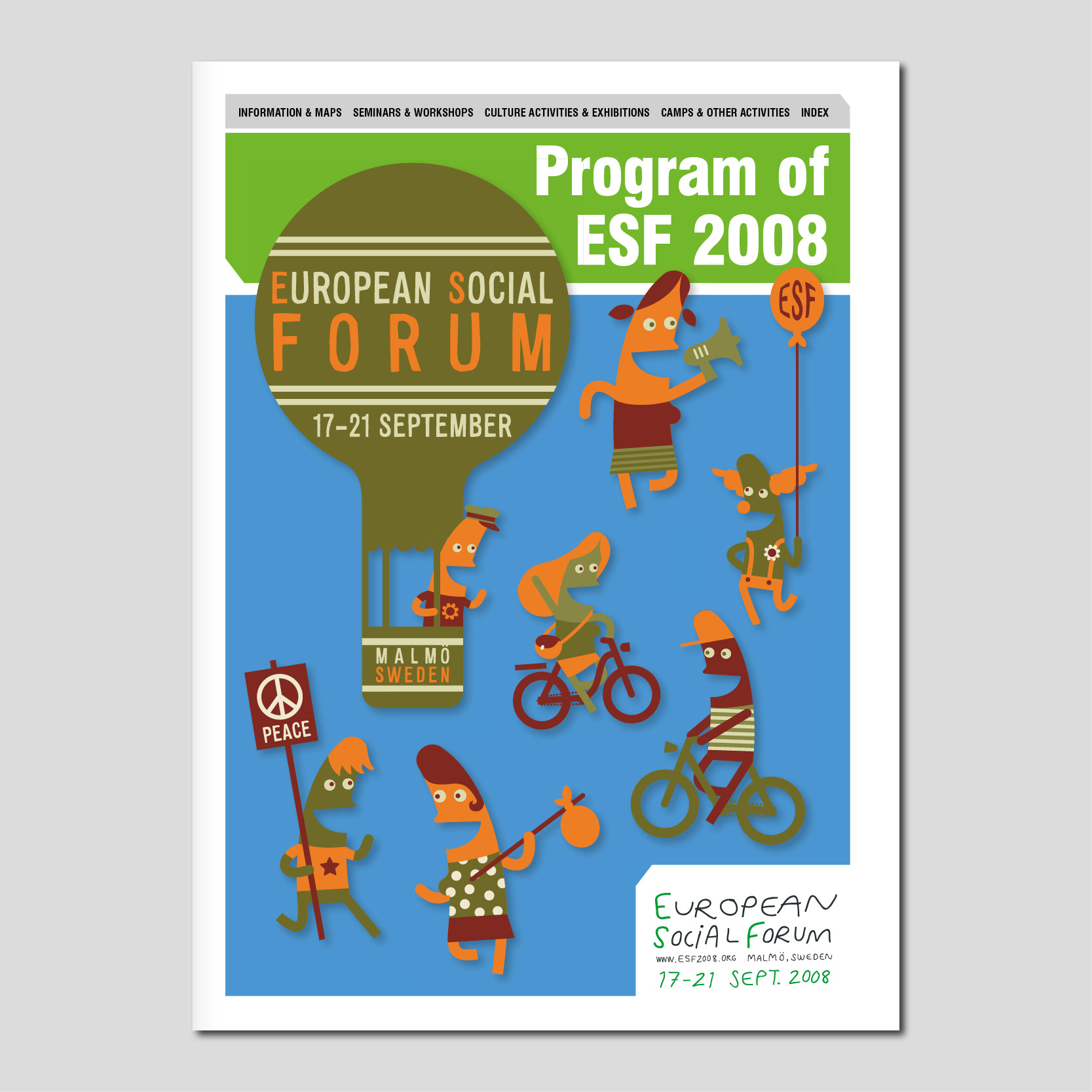 När det europeiska sociala forumet kom till Malmö gjorde jag programtidningen samt skötte projektledningen av densamma. Illustration: Titom. 2008.